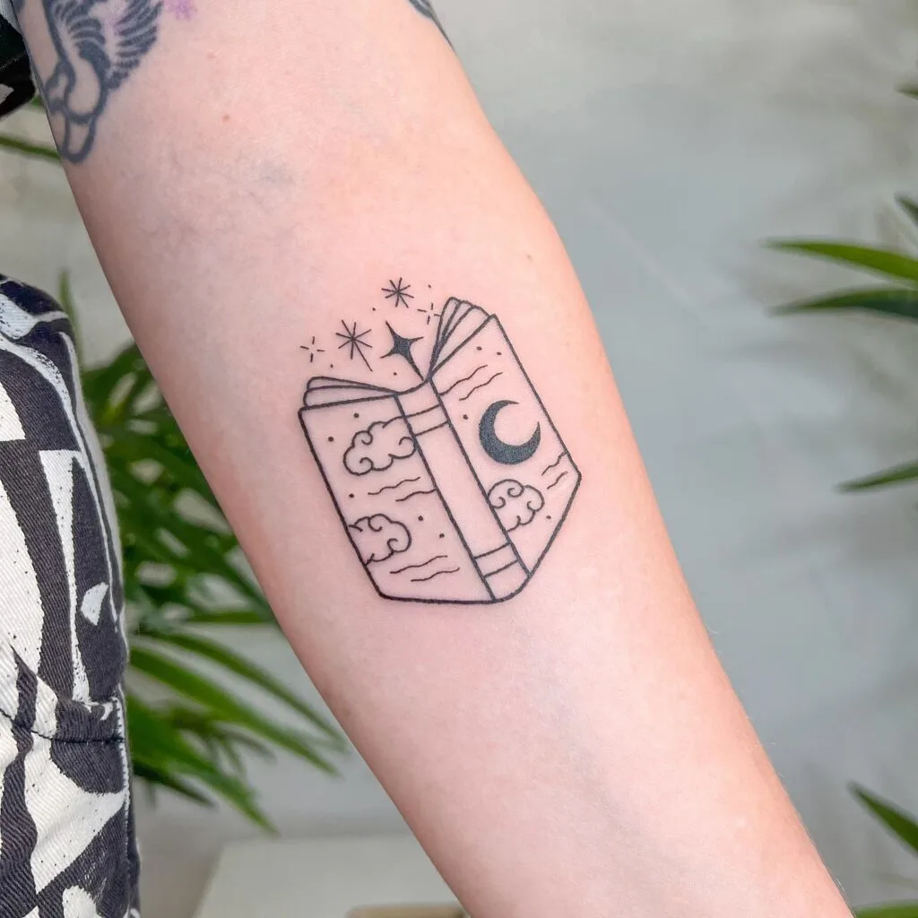 The bold lines and minimalist style give it a clean and modern feel. It’s a perfect tattoo for someone who sees books as portals to cosmic adventures and finds inspiration in the mysteries of the night sky and the magic of storytelling.