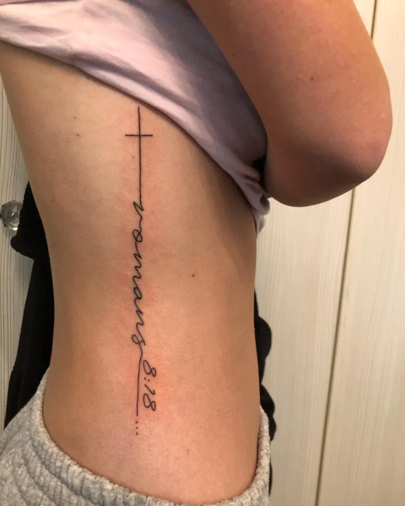 Placed along the ribcage, this tattoo feels deeply personal—close to the heart and hidden unless chosen to be seen. It’s a reminder that today’s pain is nothing compared to the glory ahead. Perfect for those who draw strength from faith during difficult seasons. Simple, elegant, and full of meaning.