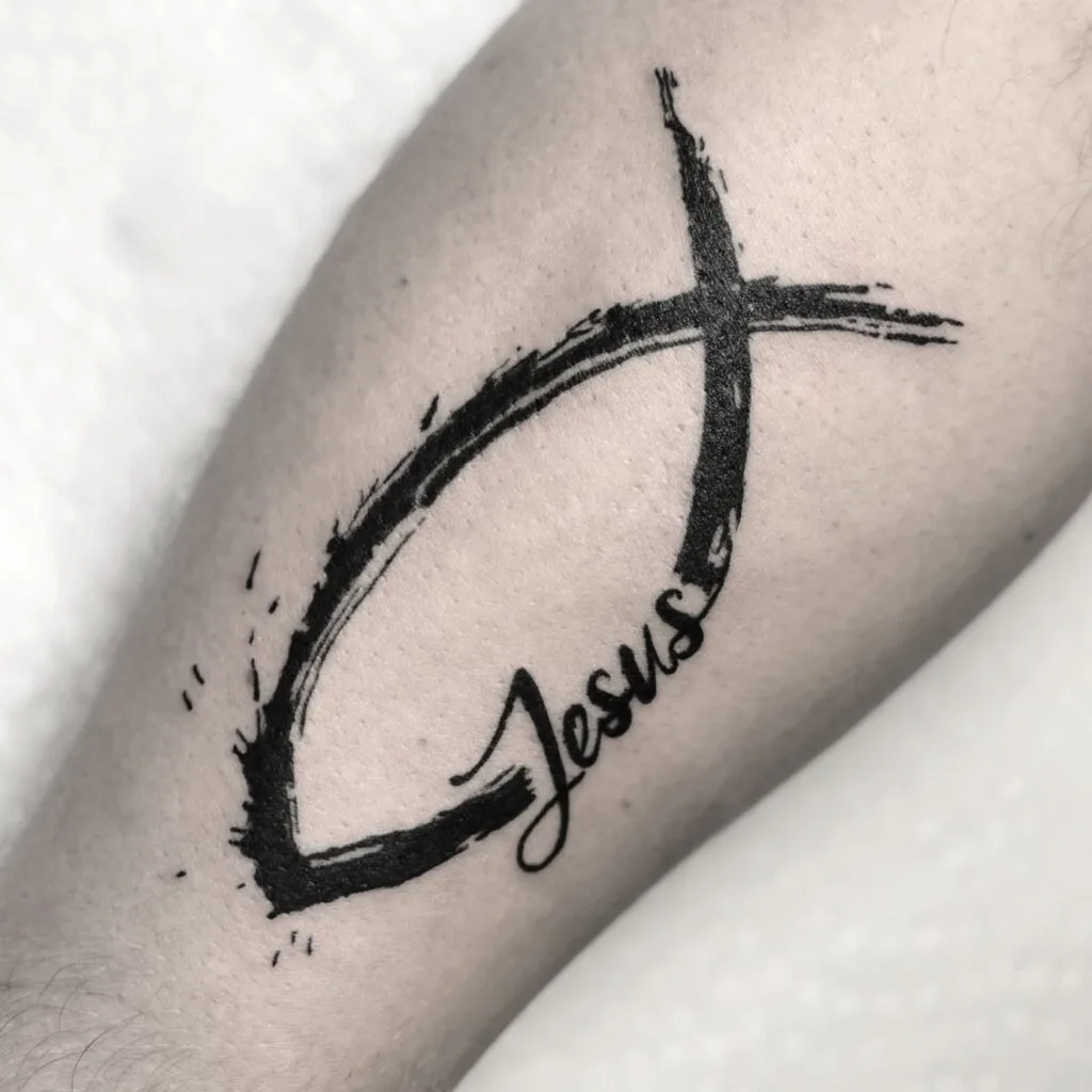 This powerful design features the ichthys, or “Jesus fish,” drawn with bold, brushstroke-style lines that create an expressive, dynamic look. Inside the fish, the name “Jesus” is written in elegant script, blending softness with strength.