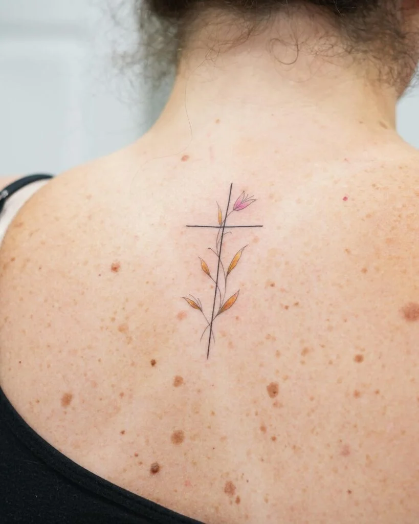 This graceful back tattoo blends a minimalist cross with soft floral elements, using thin black lines for structure and subtle hints of color for life. A single pink bloom at the top and warm golden leaves along the stem add warmth and depth, symbolizing new life, growth, and unwavering faith.