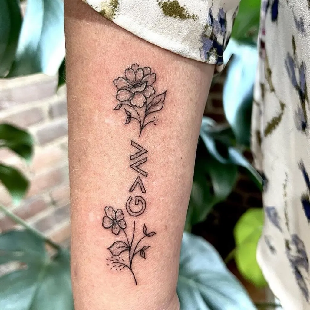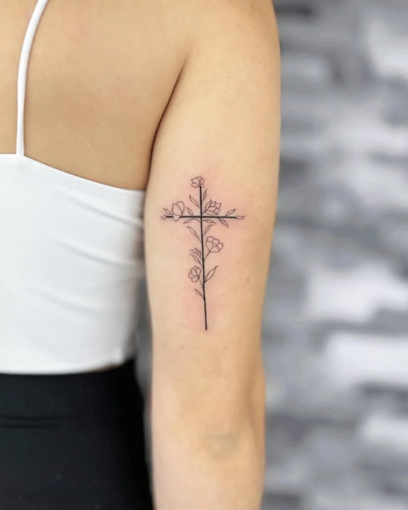 This beautifully minimalist tattoo blends delicate flowers with the shape of a cross, forming a graceful and faith-filled design. The cross itself is subtly created using stems and blooms, reminding us of how faith can grow and flourish in gentle ways.
