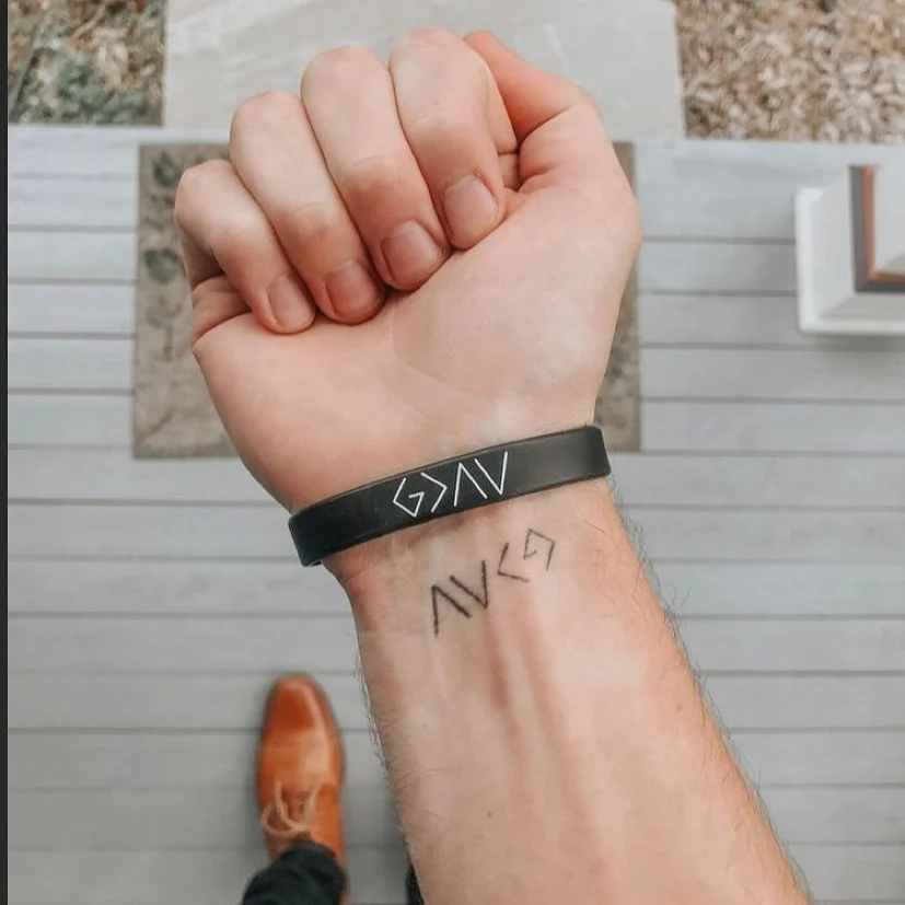 This minimalist wrist tattoo uses simple symbols—G > ∧ ∨—to represent a powerful truth: God is greater than the highs and lows.