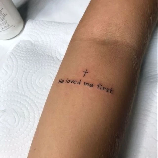 This minimalist tattoo gently declares a powerful truth: “He loved me first,” accompanied by a tiny cross just above the phrase. Inspired by 1 John 4:19, it’s a quiet, heartfelt reminder that God’s love came before anything else.