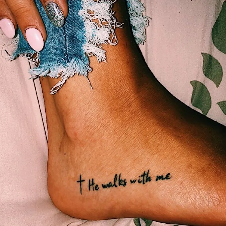 This simple and heartfelt ankle tattoo reads “He walks with me,” paired with a tiny cross that adds a quiet touch of faith. Placed right where your foot meets the ground, it symbolizes God’s constant presence with every step you take.