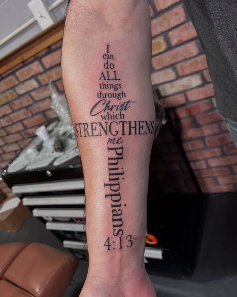 This bold tattoo turns the empowering verse Philippians 4:13 into the shape of a cross. The vertical text reads “Philippians 4:13,” while the horizontal line highlights the verse itself: “I can do all things through Christ which strengthens me.”