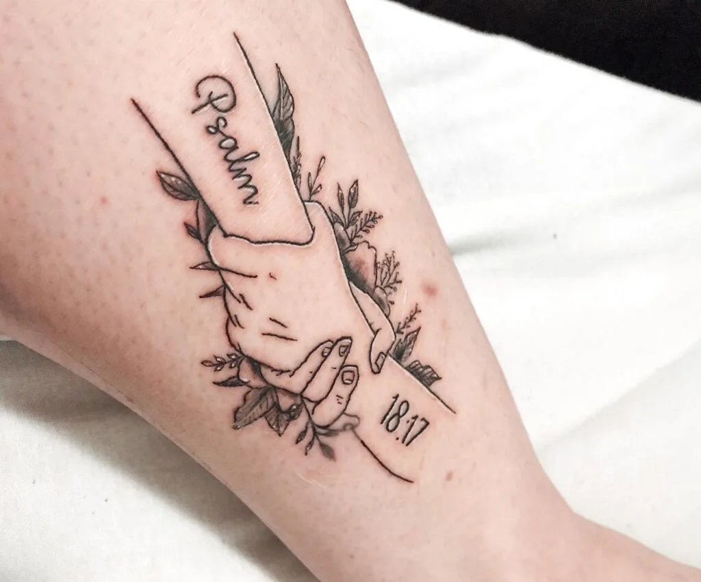 This touching tattoo features two hands clasped in a firm, rescuing grip, framed by delicate botanical accents. The arms are labeled with “Psalm” and “18:17,” referencing the verse where God reaches down to rescue us from deep waters.