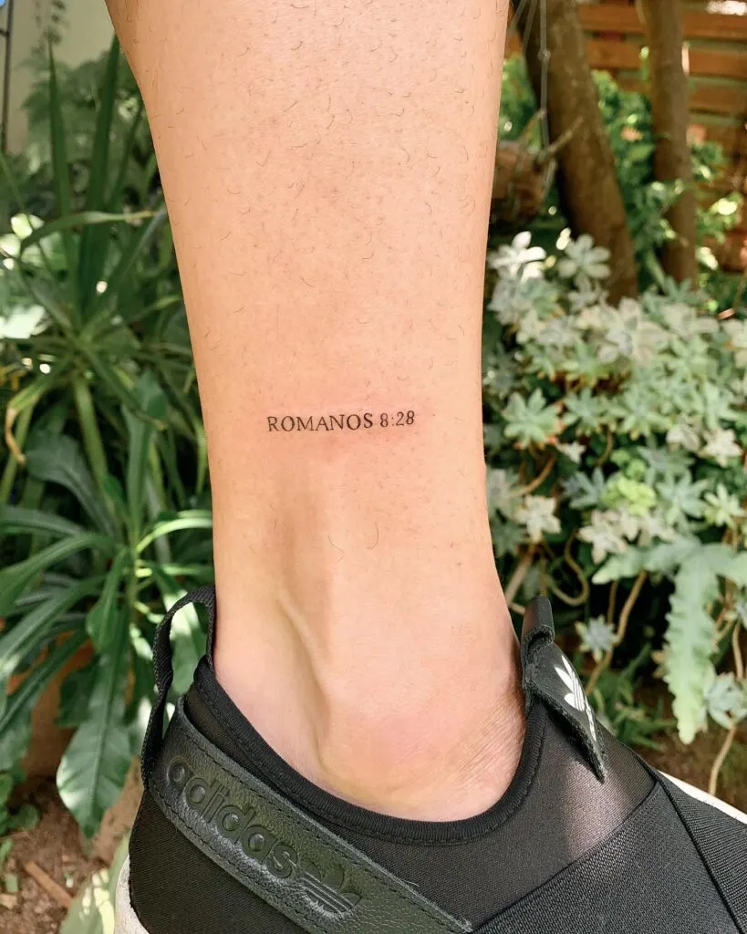 This minimalist ankle tattoo features the verse reference “ROMANOS 8:28” in clean, uppercase lettering. Written in Spanish, it translates to the powerful reminder that God works all things together for good for those who love Him.