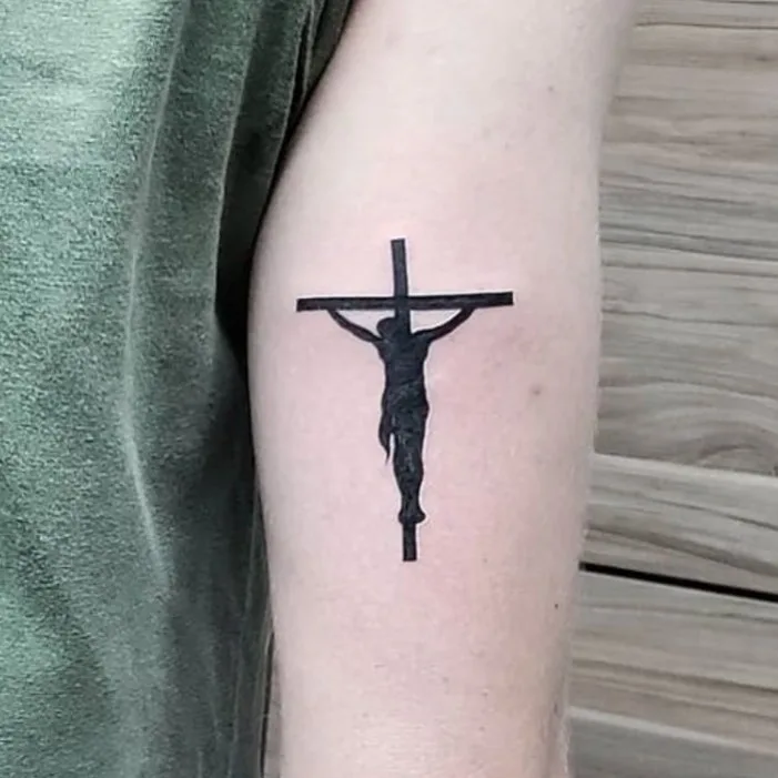 This powerful minimalist tattoo depicts the silhouette of Jesus on the cross, using bold black ink for a striking and solemn look. The simplicity of the design captures the depth of the moment—sacrifice, love, and redemption all in one image.