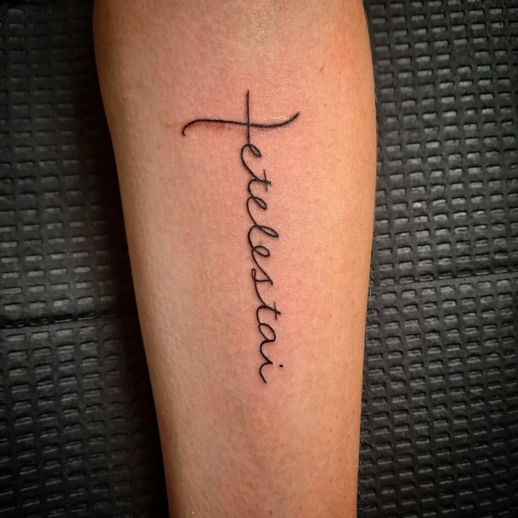 This minimalist tattoo features the word “Tetelestai” written vertically in elegant script, with the first letter “T” forming a subtle cross. “Tetelestai” is Greek for “It is finished,” the final word spoken by Jesus on the cross—signifying the completion of His sacrifice.