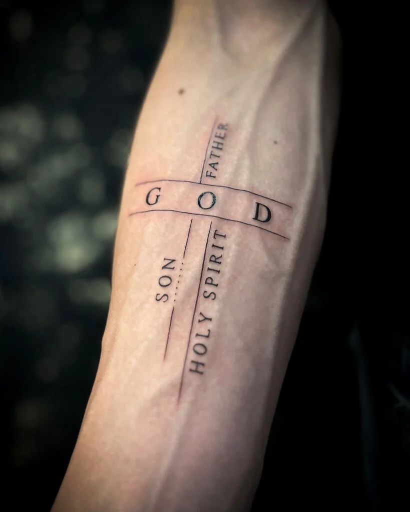This forearm tattoo features a clean-lined cross that beautifully illustrates the Holy Trinity. “GOD” sits at the center, with “FATHER,” “SON,” and “HOLY SPIRIT” branching outward in each direction.