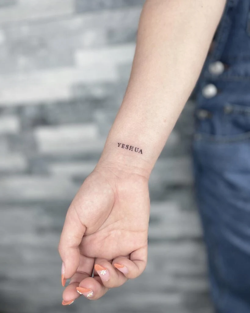 This minimalist wrist tattoo features the name “YESHUA,” the original Hebrew name for Jesus, rendered in clean, bold letters. Its simplicity is its strength—no extra symbols, just the sacred name standing alone in reverence.