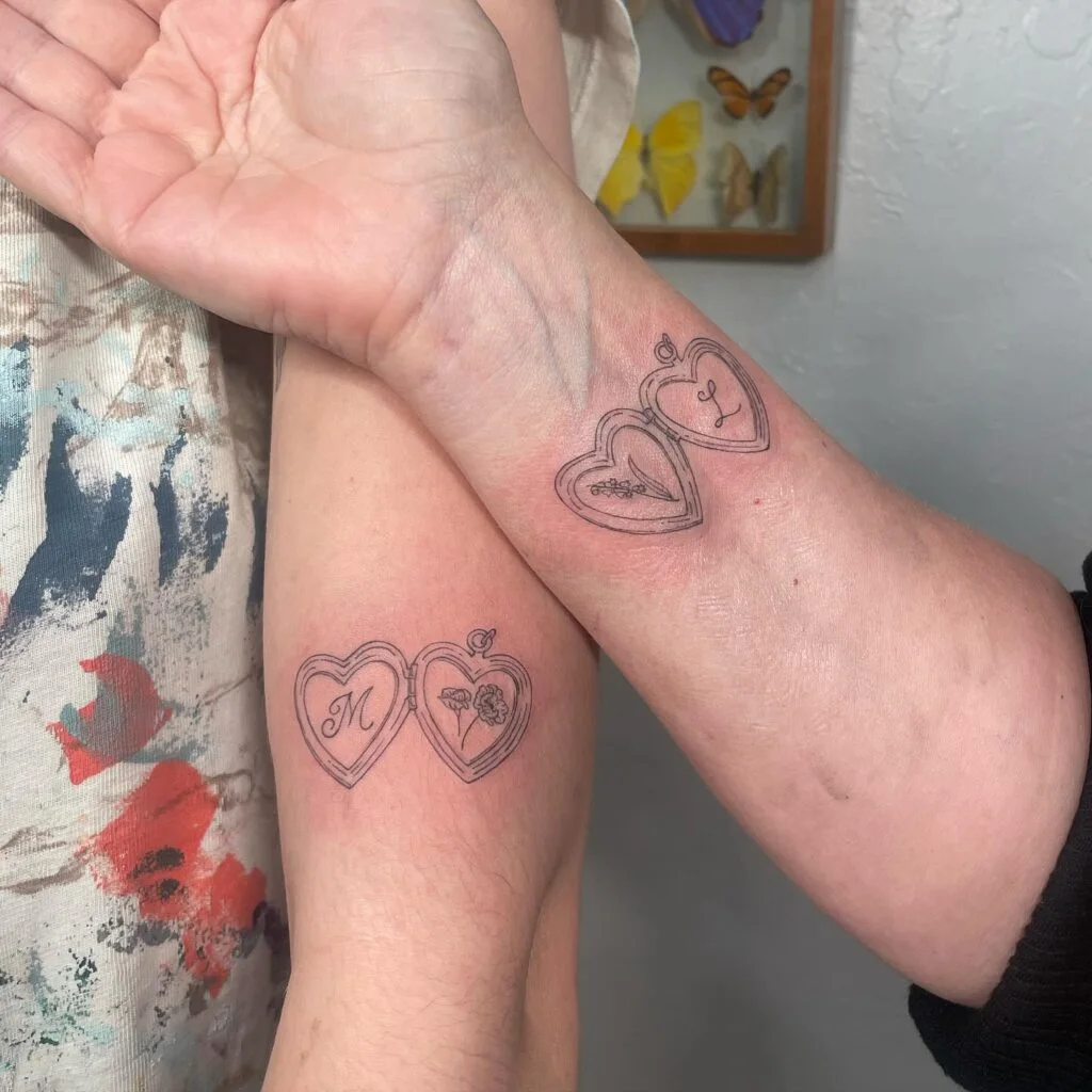 These sentimental matching tattoos depict heart-shaped lockets, each delicately drawn to resemble open pendants revealing meaningful contents. Inside each locket are personalized initials and tiny flowers, symbolizing identity and emotional connection. The initials “M” and “L” along with simple blossoms give a nostalgic, keepsake-like feel—just like real lockets worn close to the heart.