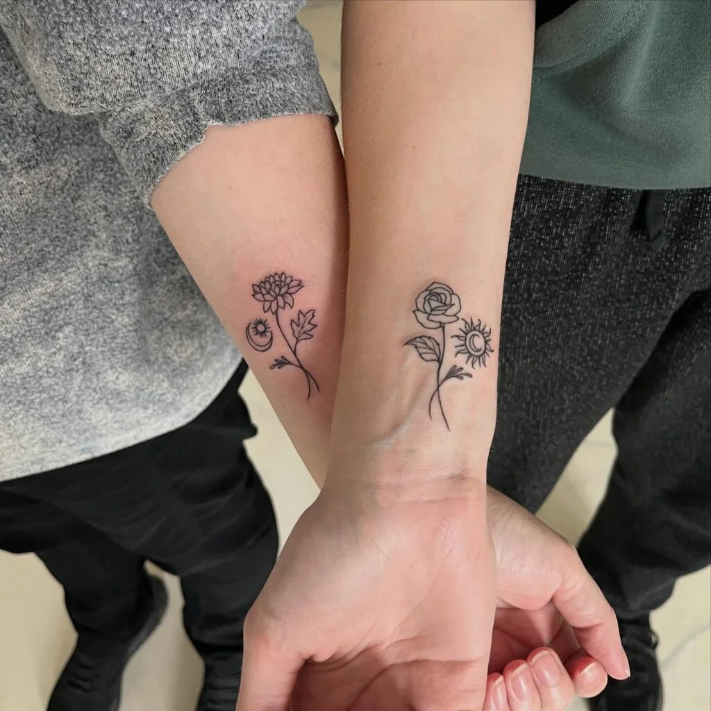 Placed delicately on the inner wrist, this minimalist design is subtle yet powerful, perfect for those who want a shared tattoo that speaks volumes without being loud. It’s a quiet reminder that no matter where life leads, their bond will always shine bright.