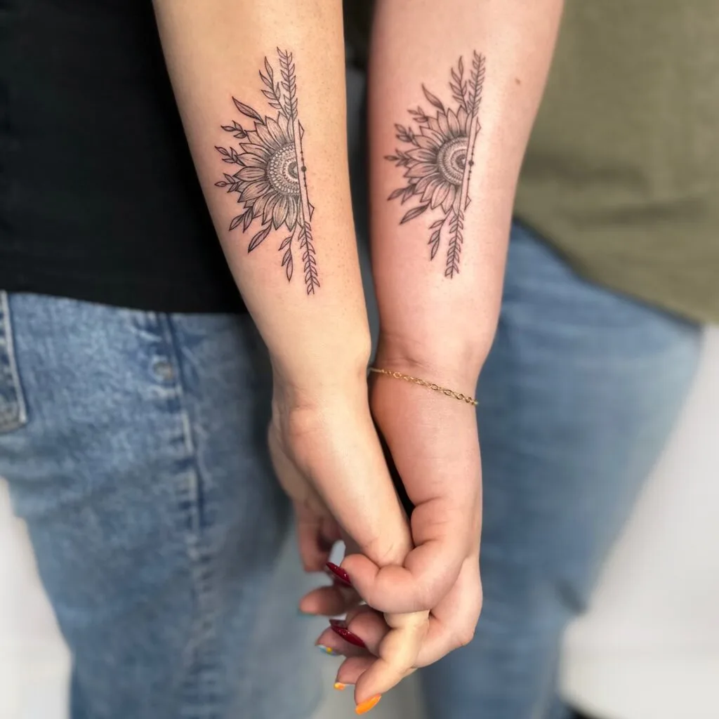When together, the tattoos form a complete sunflower—symbolizing unity, joy, and unconditional love. It’s a powerful representation of how each person is whole on their own but even stronger and brighter when together. Perfect for celebrating an unbreakable bond.