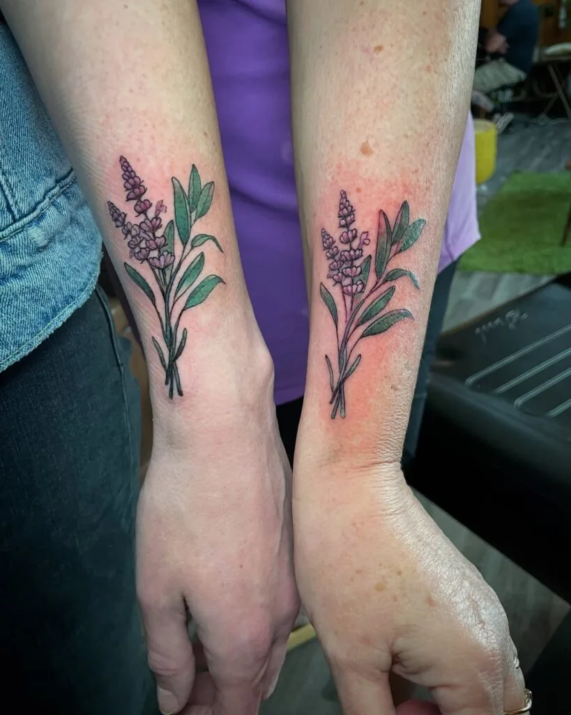 These vibrant forearm tattoos feature matching sprigs of lavender, symbolizing calm, grace, and enduring love. The soft purple blooms and green leaves are delicately shaded, creating a natural and elegant look.