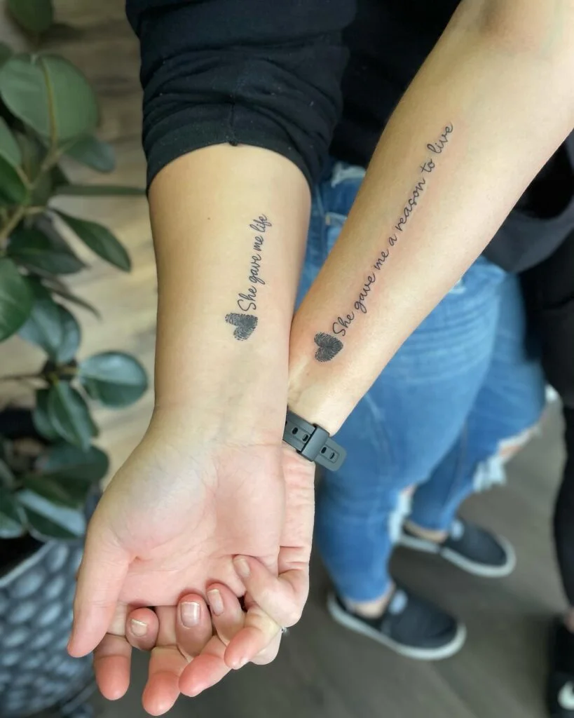 This deeply emotional mother-daughter tattoo features meaningful quotes paired with tiny heart-shaped fingerprints. One arm reads, “She gave me life,” while the other completes the sentiment with, “She gave me a reason to live.” The matching fingerprints add a personal, one-of-a-kind touch, symbolizing individuality within their shared bond.