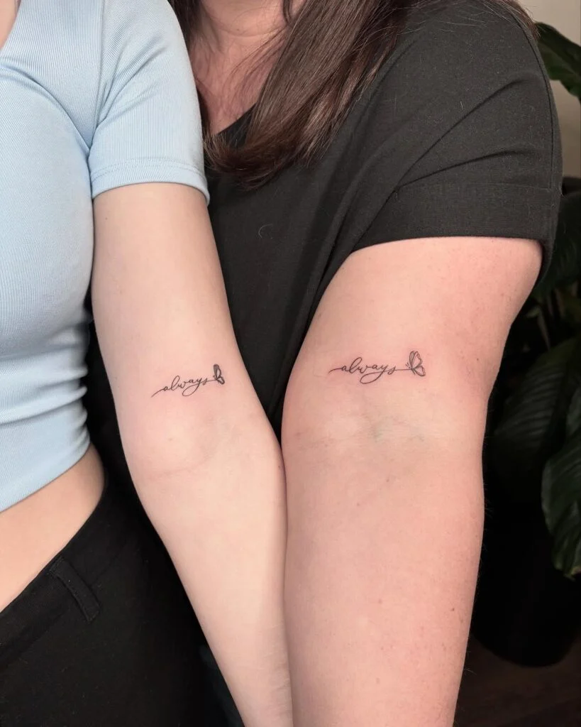 These sweet and minimalist matching tattoos feature the word “always” written in delicate script, ending with a tiny butterfly. Placed on the outer arms, the design expresses a timeless promise of presence and love between mother and daughter.
