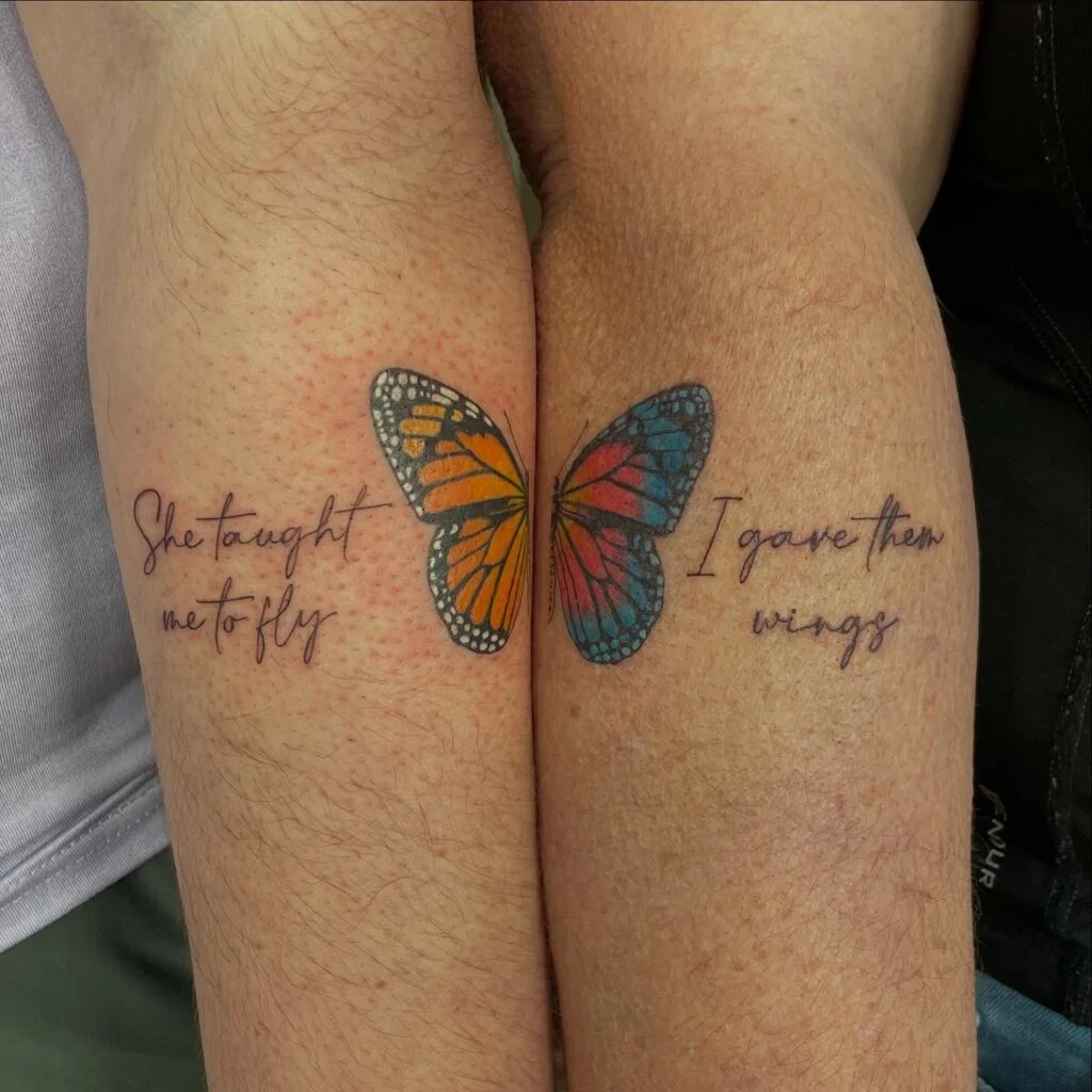 This touching mother-daughter tattoo features a beautifully split butterfly, with each half inked on separate arms. One side reads, “She taught me to fly,” while the other says, “I gave them wings.” The butterfly’s vibrant orange, pink, and blue shades symbolize transformation, freedom, and growth.