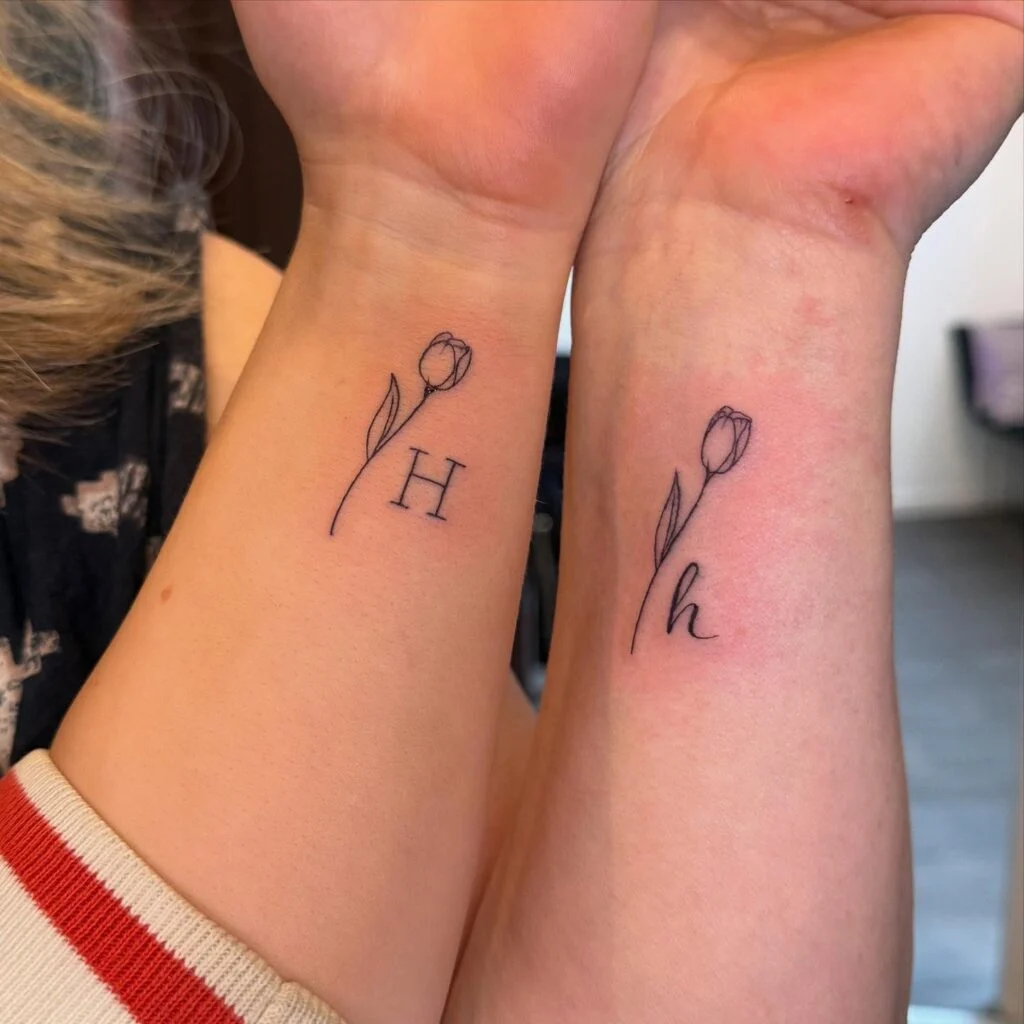 These delicate matching wrist tattoos feature a fine-line tulip paired with the letter “H” in uppercase and lowercase. The tulip, symbolizing love and new beginnings, is gently drawn above the initials, giving each design a personal and elegant touch.