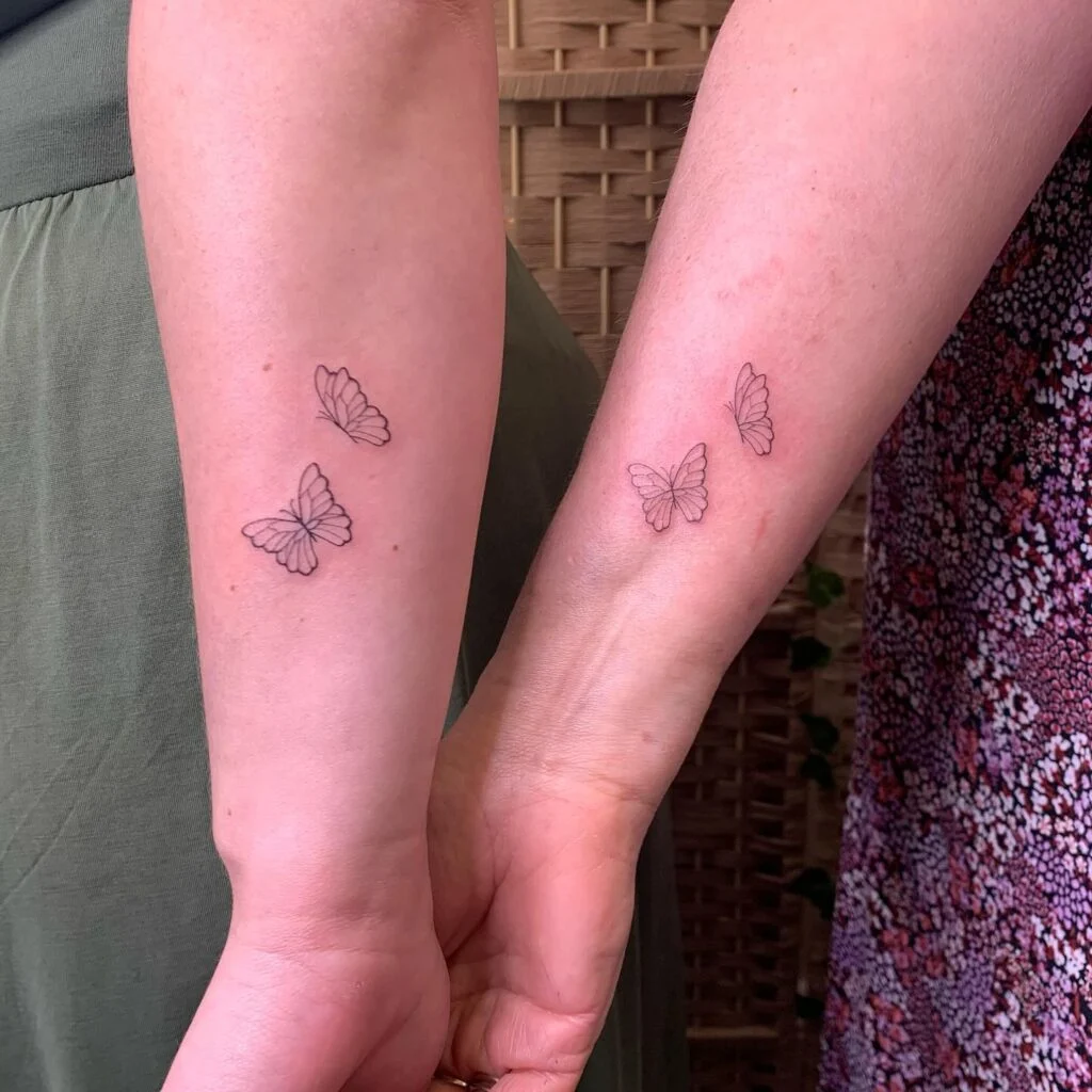 This delicate mother-daughter tattoo features a matching trio of fine-line butterflies, placed gracefully on the forearm. Each set includes three butterflies in gentle motion, representing growth, freedom, and the ever-evolving bond between mother and daughter.
