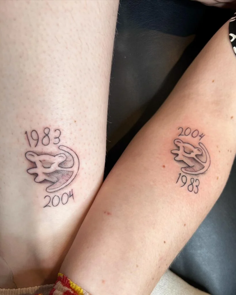 This meaningful mother-daughter tattoo pairs the years 1983 and 2004 with a creative yin-yang symbol that incorporates two abstract, intertwined figures. Each person wears the other’s birth year, flipping the sequence to highlight mutual respect and the full-circle nature of their bond.