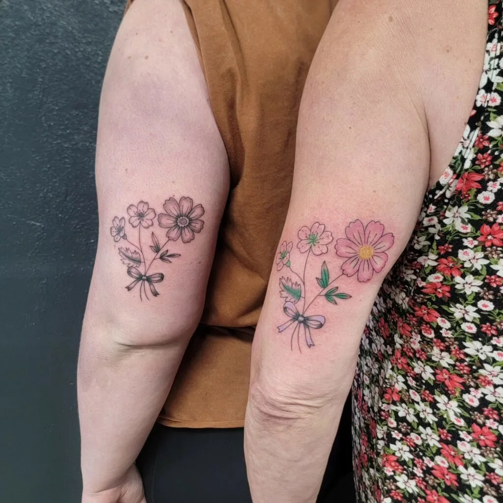 Though not identical, the complementary elements celebrate individuality while emphasizing a shared bond. This design is perfect for mothers and daughters who want matching tattoos that still express their unique personalities.