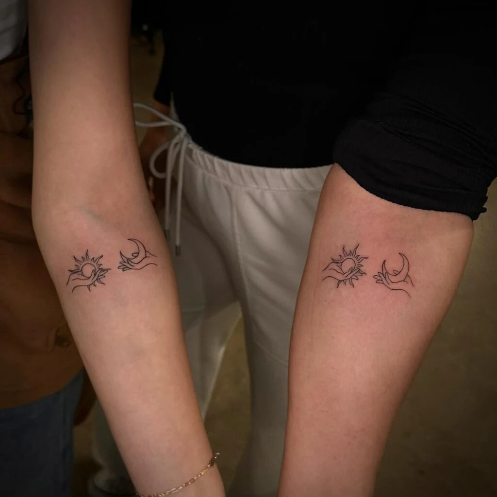 This beautifully balanced mother-daughter tattoo features two symbolic scenes: a radiant sun cradled by a hand, and a serene crescent moon held by another. These complementary images represent harmony, duality, and the strength of opposites—one bringing light, the other calm.