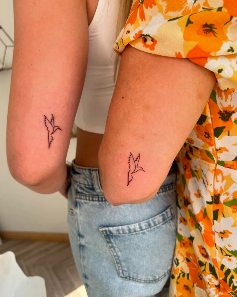 These matching mother-daughter tattoos feature the simple, graceful outline of a bird in flight. The clean design captures the essence of freedom, growth, and shared journeys—making it a powerful symbol of support and independence.