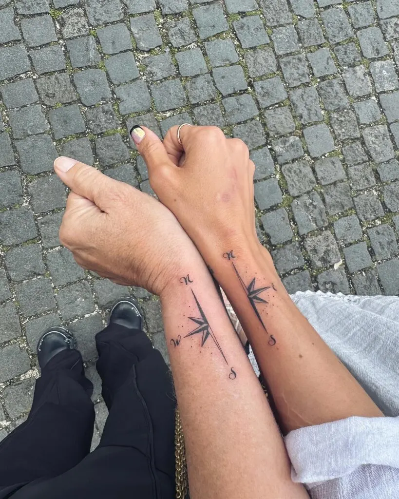These striking mother-daughter tattoos feature identical compass designs inked on the forearm, symbolizing guidance, direction, and a shared journey through life. The clean black lines and minimalist points—marking north, south, east, and west—represent stability and the sense of always being able to find your way back to each other.