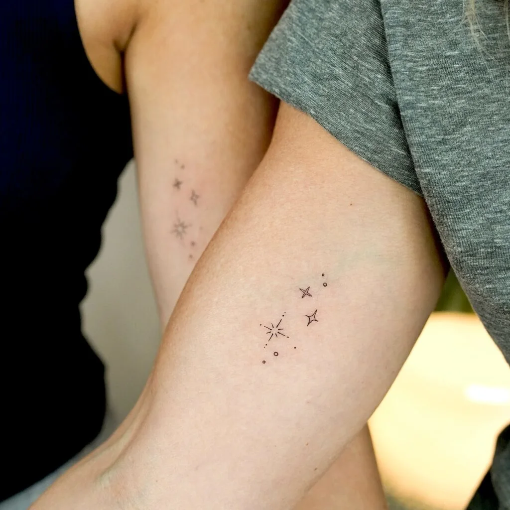 These minimalist mother-daughter tattoos feature a dainty collection of stars and tiny dots, forming a delicate celestial cluster on the upper arms. Each tattoo is slightly unique, yet they mirror one another beautifully—symbolizing how two souls can shine individually while still belonging to the same constellation.