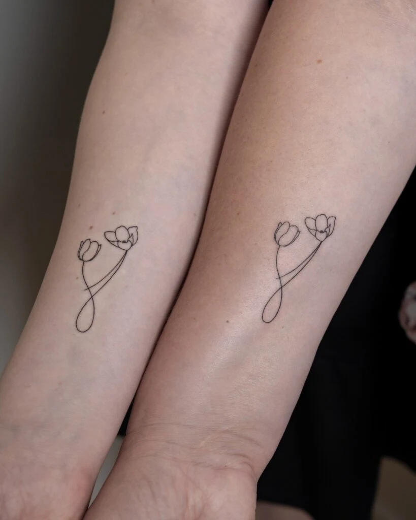 This elegant matching tattoo features two tulips drawn in a single continuous line, symbolizing unity and simplicity. The flowing line art captures the graceful connection between mother and daughter, with each bloom representing one of them.