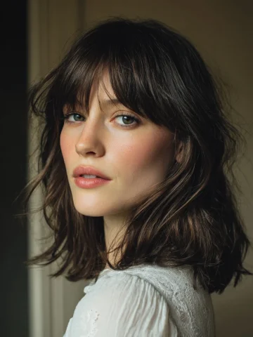 A wavy wolf cut with bangs blends tousled texture, layered volume, and face-framing fringe into one easygoing yet edgy look. Natural waves soften the shaggy crown, while bangs anchor the shape and draw attention toward the eyes. The back usually keeps length for flow, preventing the cut from feeling choppy or harsh. Density, wave pattern, …
