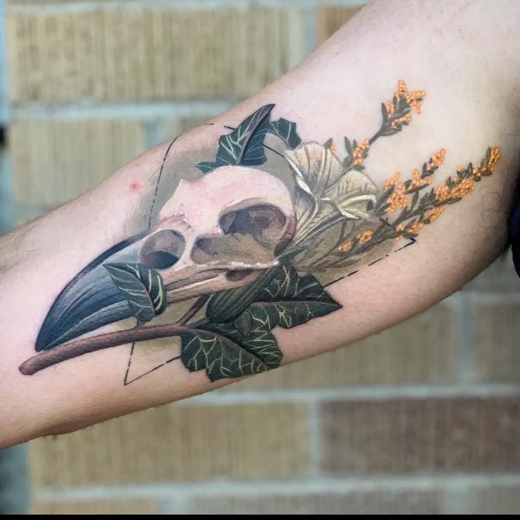 This vibrant tattoo features a lifelike raven skull nestled among ivy leaves, delicate white flowers, and sprigs of orange blossoms. The skull is rendered in soft, realistic tones, while the deep green leaves and warm floral hues add lush contrast.