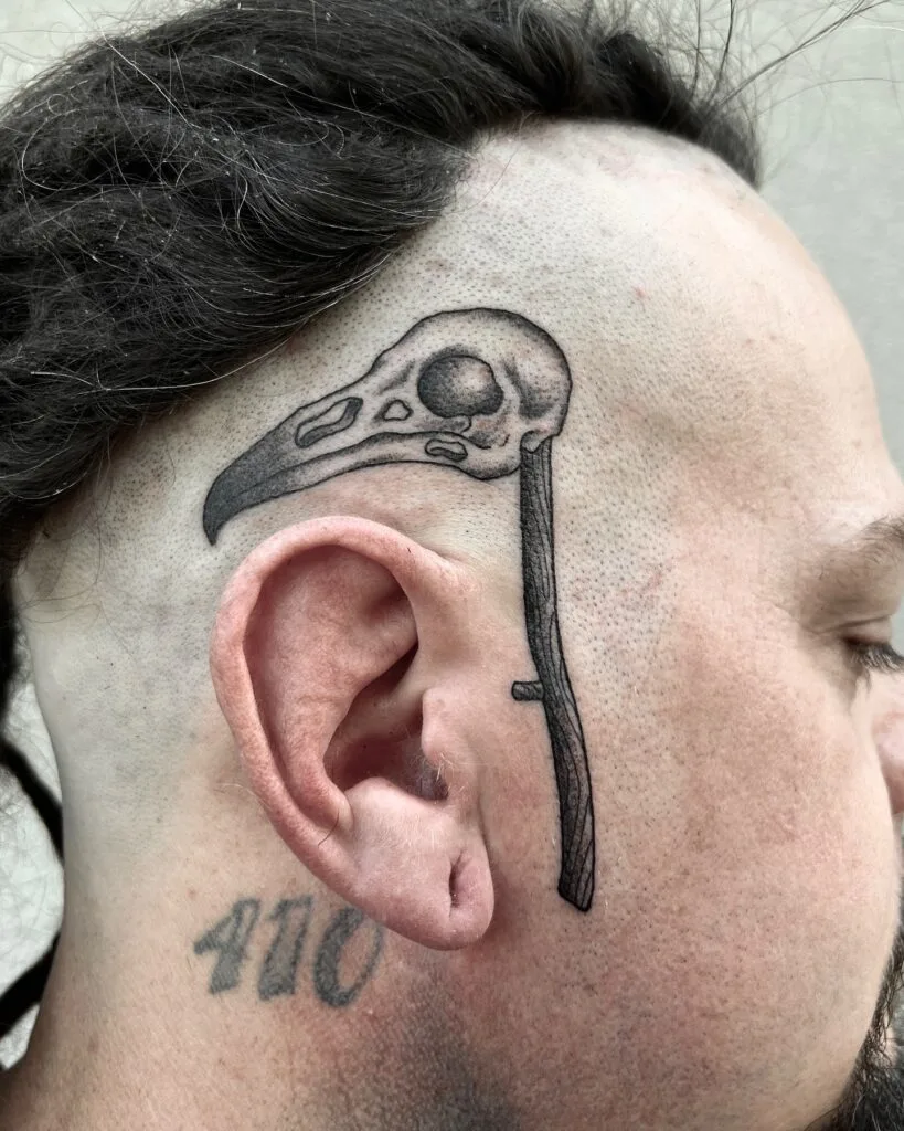 This unique tattoo is placed boldly on the side of the head, just above the ear, and features a detailed raven skull resting on a small branch.
