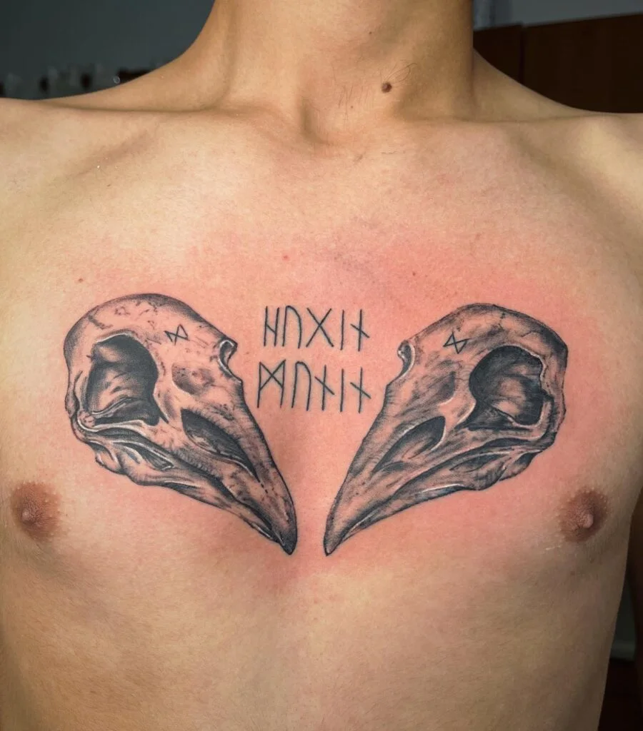 This powerful chest tattoo features two mirrored raven skulls facing each other, with bold black shading and fine detail across each beak and hollow socket. Between the skulls, a set of Nordic runes is inked in clean lines, adding a mystical and ancient energy to the piece.