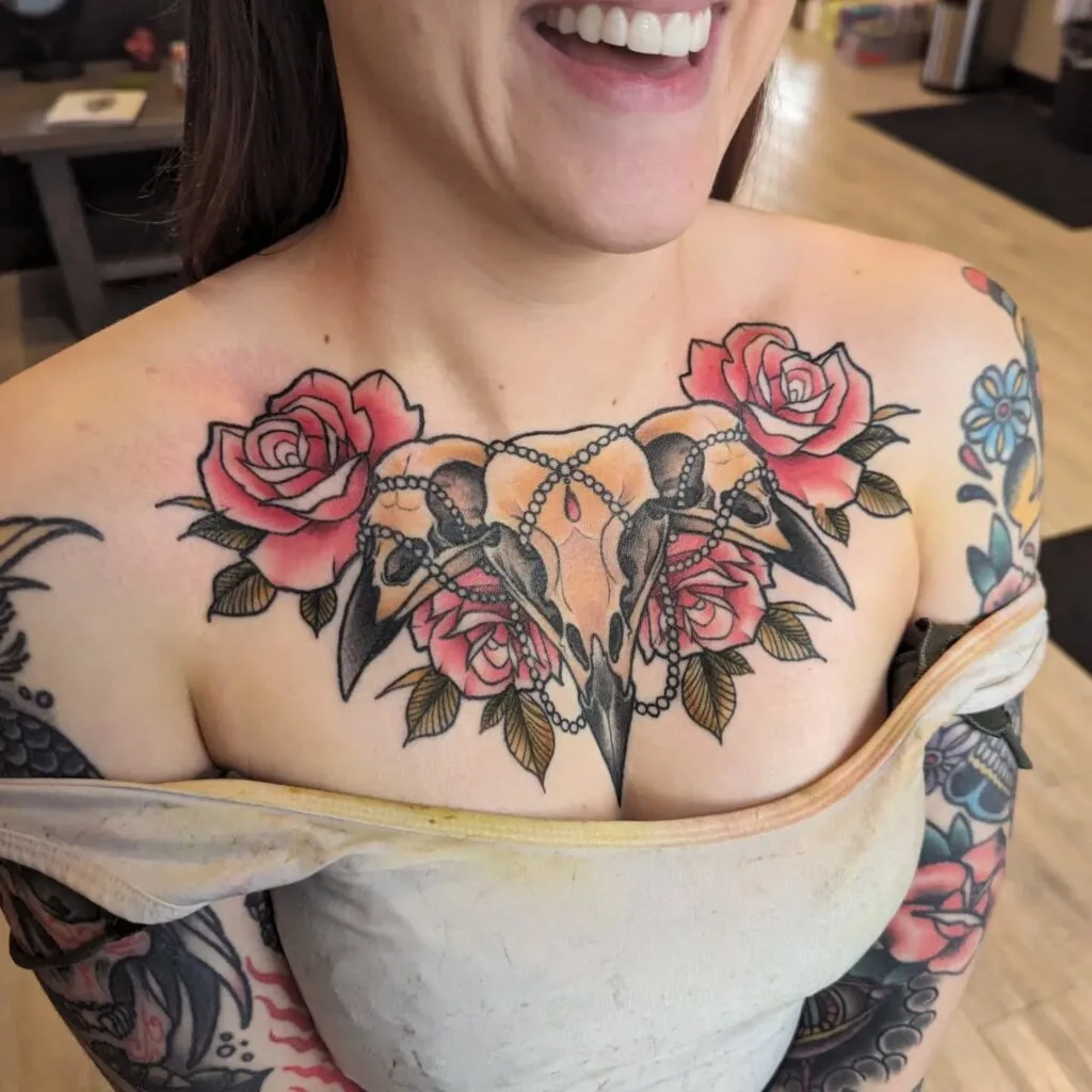 Ornamental Raven Skulls and Roses Chest Tattoo