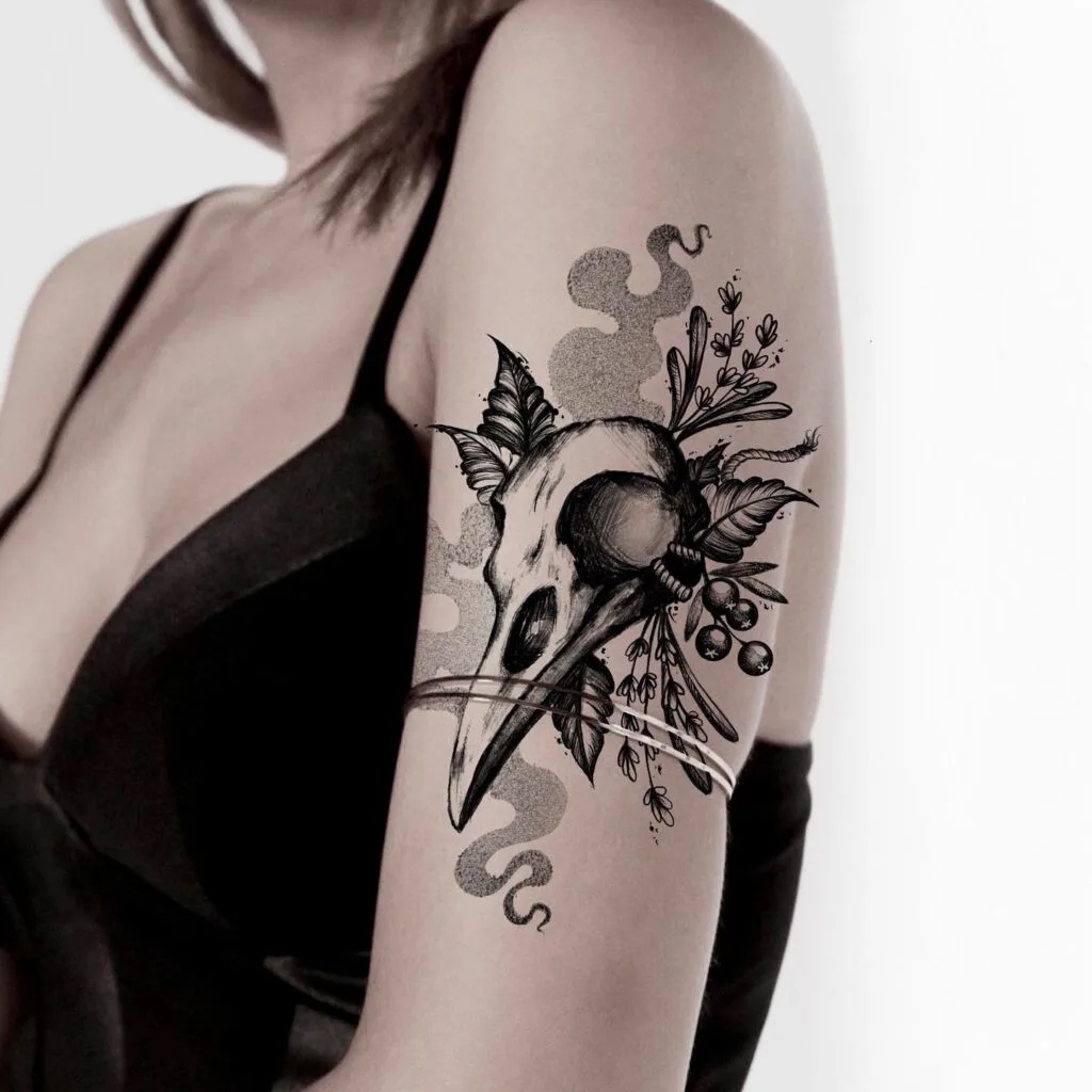 Raven skull tattoos blend themes of mystery, transformation, and mortality into one powerful design. The raven symbolizes intelligence, prophecy, and the unknown, while the skull adds an element of mortality and the cycle of life. Together, they create a striking tattoo that carries deep symbolic weight and a bold visual impact.