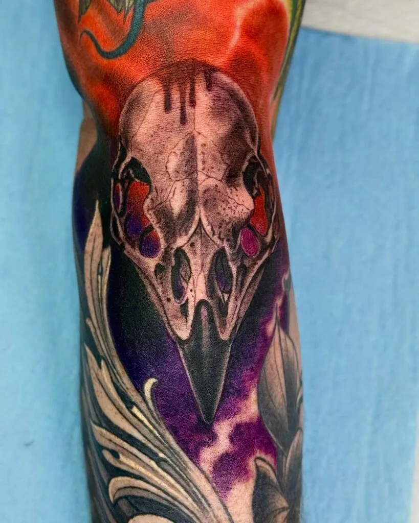 This striking tattoo features a raven skull inked with smooth black and grey shading, surrounded by bold, colorful details. Splashes of red, purple, and orange create a dramatic backdrop, with lightning-like effects cutting through the background for added intensity.