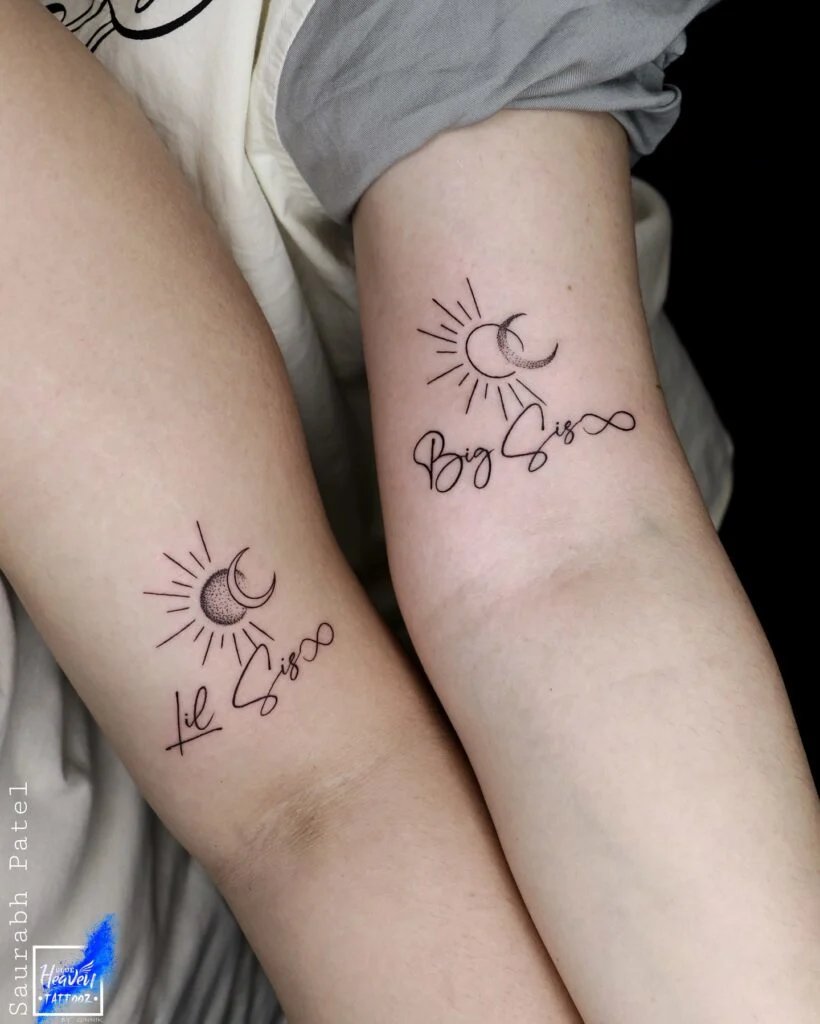 These matching tattoos feature a crescent moon surrounded by radiating sun rays, paired with the words “Big Sis” and “Lil Sis” in elegant script. An infinity symbol flows from the lettering, representing an everlasting bond.