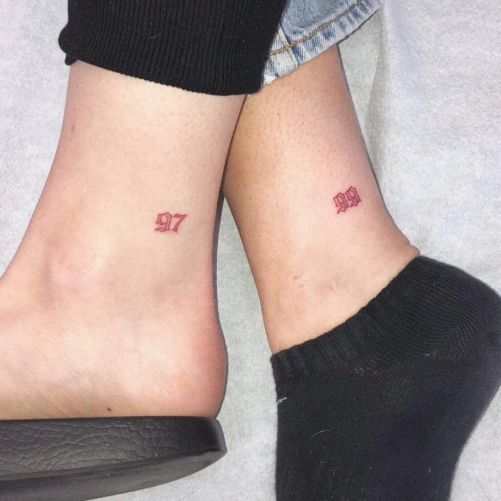 These matching ankle tattoos showcase the numbers “97” and “99” in bold red Gothic-style font, representing each sister’s birth year. The minimalist yet striking design uses vivid red ink for a modern twist on classic typography.