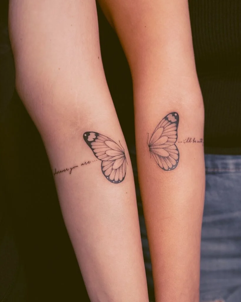 These vibrant matching forearm tattoos feature elegant butterflies surrounded by ornamental accents, with the word “Always” written below in a playful handwritten style.