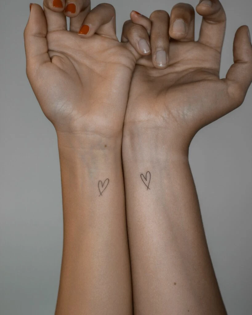 These dainty wrist tattoos feature identical hand-drawn heart outlines, each formed with a single, continuous line. The minimalist design keeps things simple yet meaningful, capturing the pure essence of love and connection between sisters.
