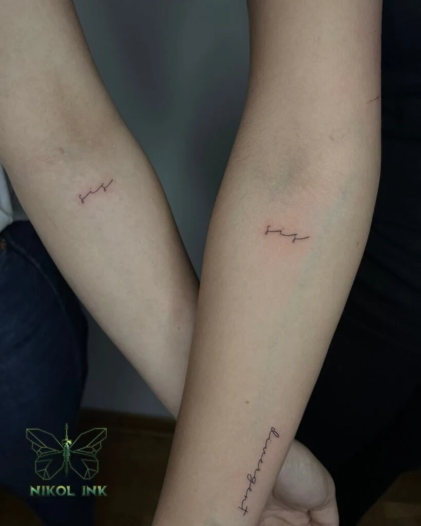 These matching forearm tattoos feature the simple yet powerful phrase “no matter where” in delicate cursive script. The message speaks to a bond that transcends distance—reminding sisters that no matter where life takes them, their connection will always remain strong.