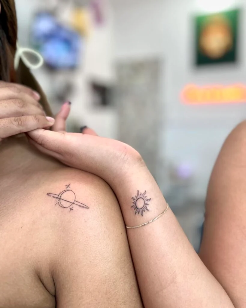 These minimalist tattoos feature a ringed planet with tiny stars on one sister and a radiant sun on the other. The cosmic pairing symbolizes balance, light, and shared orbits—perfect for sisters who feel like they’re each other’s universe.