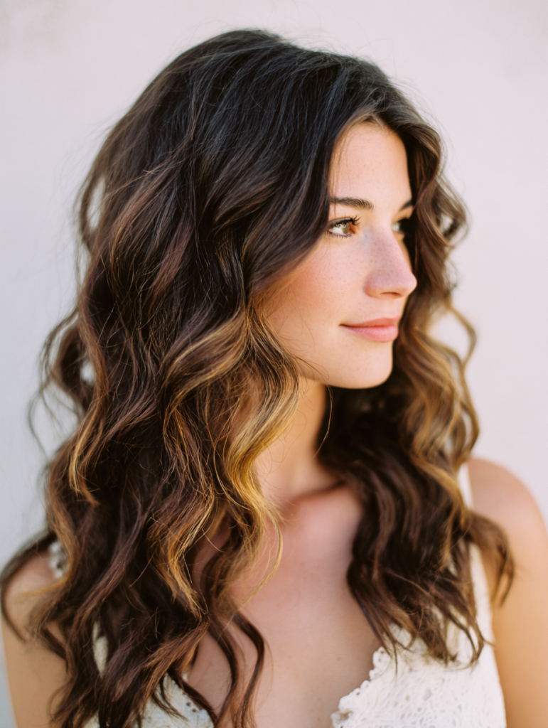 Gentle waves paired with sun-kissed brunette tones create a relaxed, coastal-inspired look that feels easy yet elevated. The highlights are placed to catch movement, adding brightness without overpowering the base color.