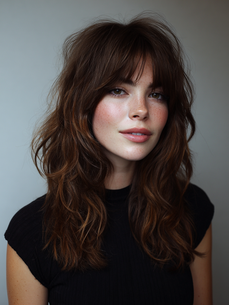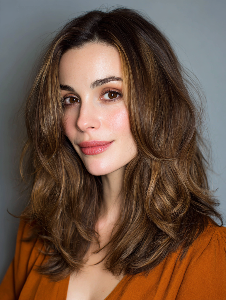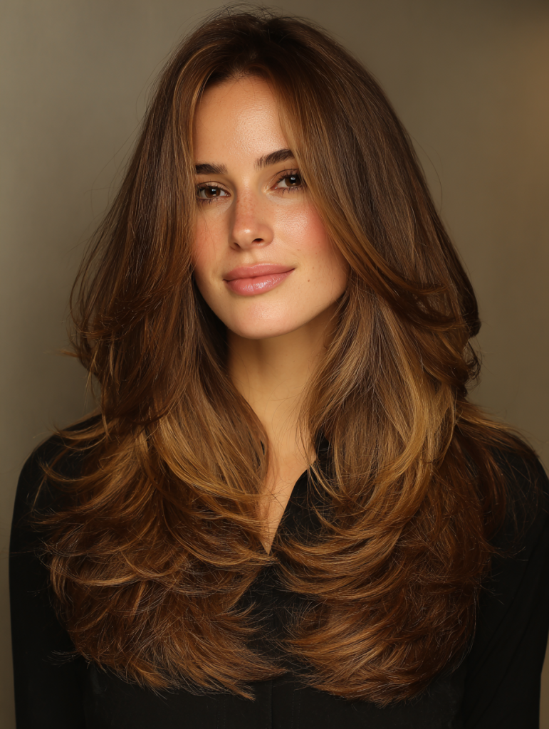 It’s especially suitable for medium to long hair lengths. Styling with a blowout technique helps frame the face beautifully, emphasizing both the layers and the warm tones.