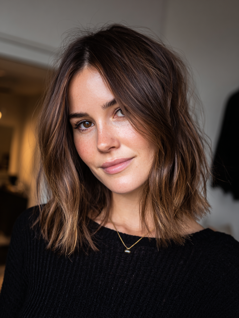 This option suits most face shapes and medium-density hair. Style with loose waves to enhance dimension. It works for everyday wear and subtle seasonal updates.