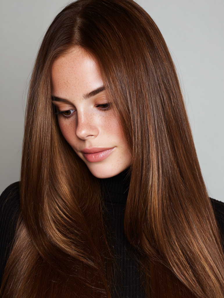 Rich chestnut tones warmed with delicate golden highlights create a glossy, radiant finish that feels timeless. This style focuses on enhancing the natural depth of brunette hair while adding just enough brightness for dimension.