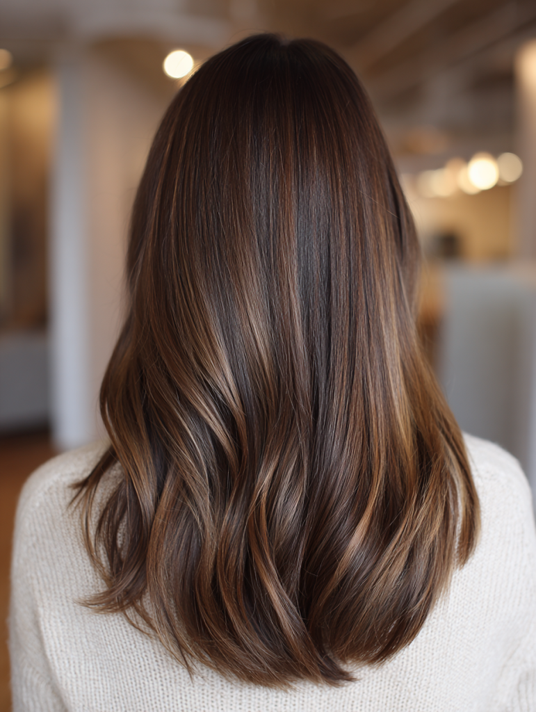 A subtle brunette balayage focuses on hand-painted highlights through the mid-lengths and ends. The transition looks seamless, and the roots remain darker for depth. Movement becomes more noticeable without heavy contrast.