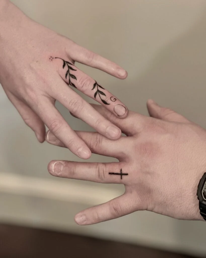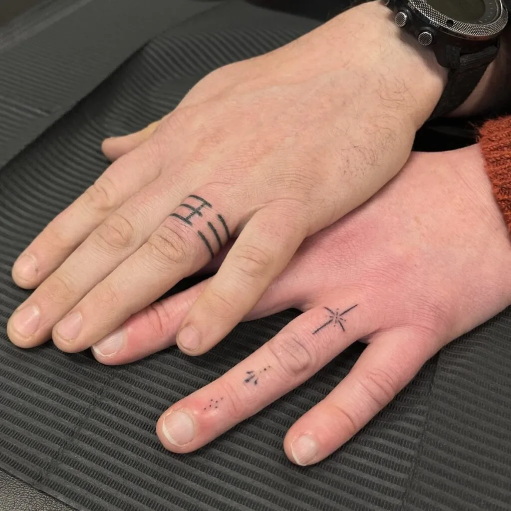 This couple opted for mismatched yet complementary tattoos on their ring fingers, each design expressing individuality and connection. One features bold horizontal lines intersected by a vertical bar, symbolizing structure and unity. The other showcases a starburst-style cross with delicate dot accents, adding a cosmic, radiant touch.